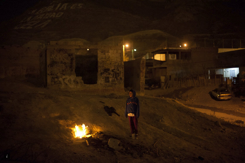 一个小男在Noveno街区烤火取暖,这里是一个老加工厂所在地。