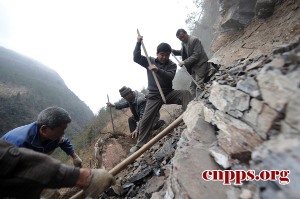 ????“愚公支书”王光国(右二)带领村民们开凿道路。