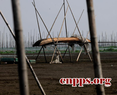 渔民将搁浅的木船架了起来