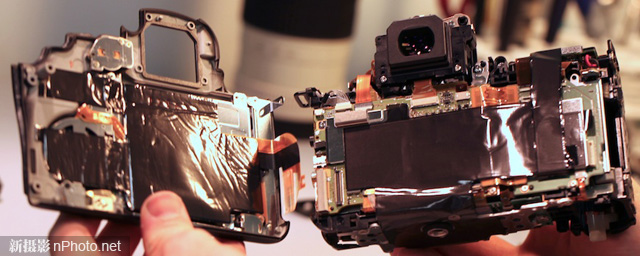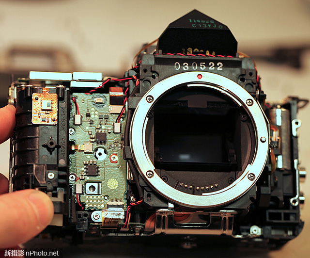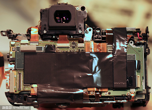 主板电路的设计也有一些改变:所有的排线都非常短,直接连接到需要连接的地方,没有来来回回的长排线。另外还有一些地方使用线束(左上角)代替了排线。总体来说,新相机内部电路设计更好,而且绝缘性更高。