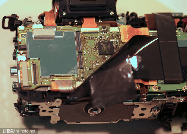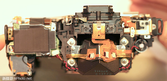 相机顶部没有什么特别之处,仍然能看到到处都是干净整齐的排线和线路。注意这台相机还没有经过“漏光修理”,顶盖内没有贴上黑胶布。