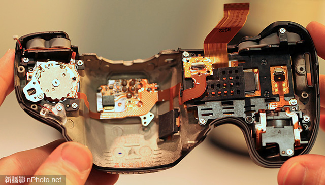 回到相机后面。覆盖的塑料胶布很容易揭起,同时Roger也发现了松动的螺丝——由于内部有良好的?;?,所以它没有到处乱跑,损坏其他地方。