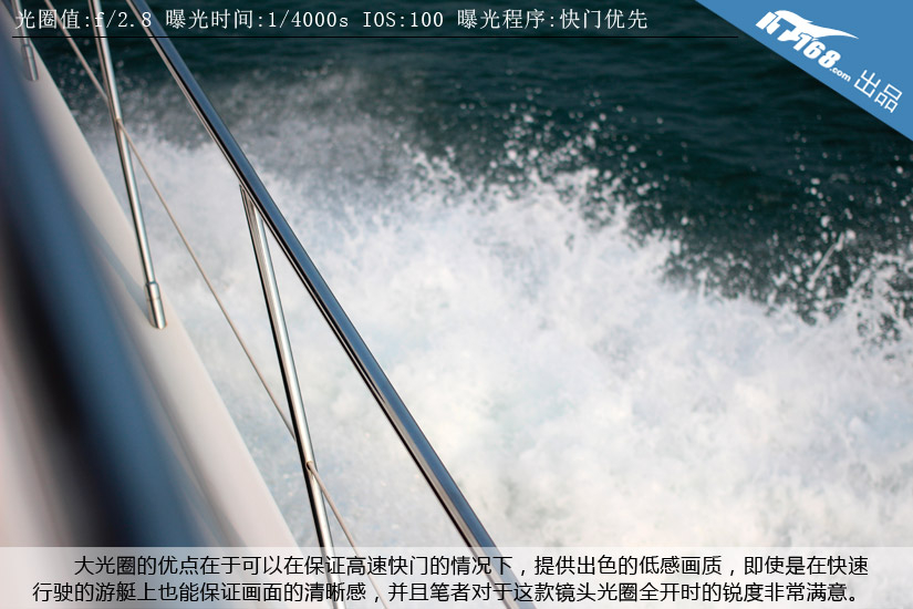 大光圈的优点在于可以在保证高速快门的情况下,提供出色的低感画质,即使是在快速行驶的游艇上也能保证画面的清晰感,并且笔者对于这款镜头光圈全开时的锐度非常满意。