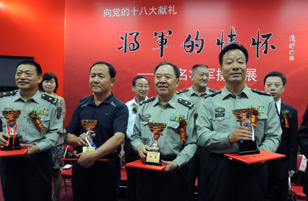 在《将军的情怀——百名将军摄影展》颁奖典礼上,获奖将军手捧奖杯和证书合影。