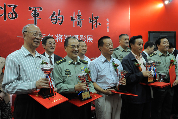 在《将军的情怀——百名将军摄影展》颁奖典礼上,获奖将军手捧奖杯和证书合影。