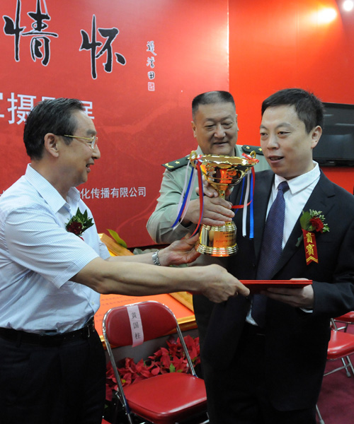 彭小枫上将(左)和解放军报社社长黄国柱少将(中)向为《将军的情怀——百名将军摄影展》作出重要贡献的北京易和中健文化传播有限公司总经理吴峰颁发特殊贡献奖奖杯和证书。