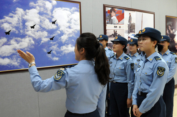 空军女战士观看《将军的情怀——百名将军摄影展》照片。