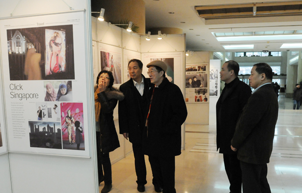 ??? 图为中国新闻摄影学会主席于宁、执行主席赵德润等在文汇报总编辑陈振平等陪同下参观上海市报纸摄影优秀专版展览。