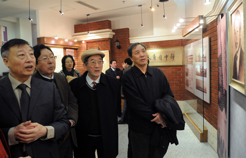 中国新闻摄影学会主席于宁(右二)、执行主席赵德润(右一)、副主席胡颖(右三)等参观东北大学校史舘。