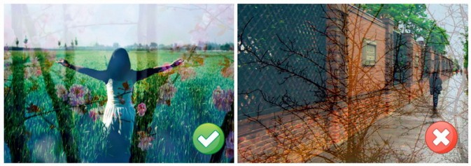 想要不杂乱就要有主次,多重曝光这个表现形式主要是表达拍摄者的主观感觉,任何画面都需要有主次,才能说明问题,所以在表达个人想法时,切记思路要明确,不要让画面杂乱无章,缺少主次对比;我们在选择场景时要尽量的简单,虽然多重曝光是加法制作,但画面感觉还是要遵循摄影的减法法则。例如错图中本身杂乱的枯树枝,加上道路围墙,整个画面显得混乱不堪,并且在颜色上也没有区分出主次;而正确图中,我是以在草丛中张开双臂的女孩为主体,排列有序的树干为陪衬,画面主次分明,既能突出主体又能发挥多重曝光制造奇异画面的魅力。