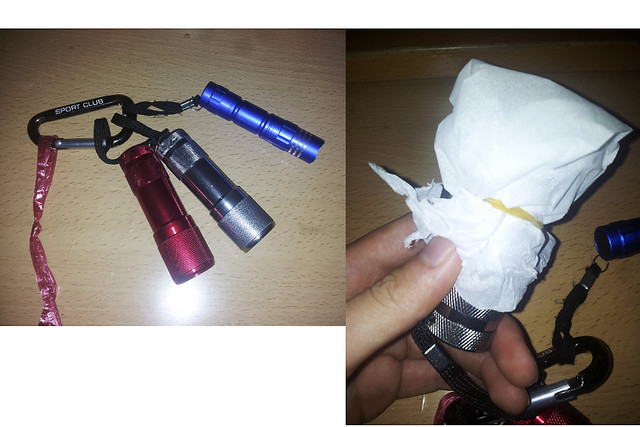 你所需要准备的1) 1~3支光力比较光猛、可以穿起来的电筒仔(有2,3倍手机电筒的光度吧)