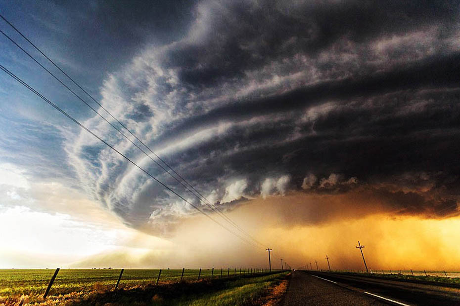 英国《每日邮电》9月11日在报道中描述了这样一幕:在辽阔的草原和寂静的公路上方,巨大的乌云层正在空中集结形成,仿佛一架太空飞船盘旋在大地的上方。世间的一切都在静候毁灭的序幕。这一幕就是超级雷雨胞形成时的景象?!睹咳沼实纭房堑囊蛔橥计?,清晰地展现了超级雷雨胞在美国“龙卷风走廊”(Tornado Alley)形成时的骇人景象。图片来源:环球网