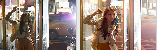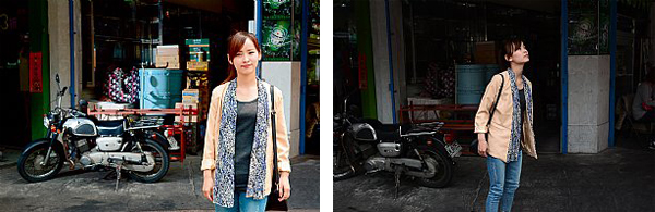 闪光灯不一定要用来对人补光,尤其在光线分布不佳,或反差过大的环境下,闪光灯的首要任务就是对环境补光。在这次范例里,Model站在街角受到阳光的照明,但背景丰富的杂货店却因无照明而丧失细节。拍摄时,让Model站在阳光照明处,再将离机闪光灯架远一点,以斜角30~45°的角度打亮背景,如此不仅能柔化闪光灯的硬度,也能拍出物体的立体感。若闪光灯架得太近,光线太过生硬;闪光灯角度太直,光线又太过呆版。