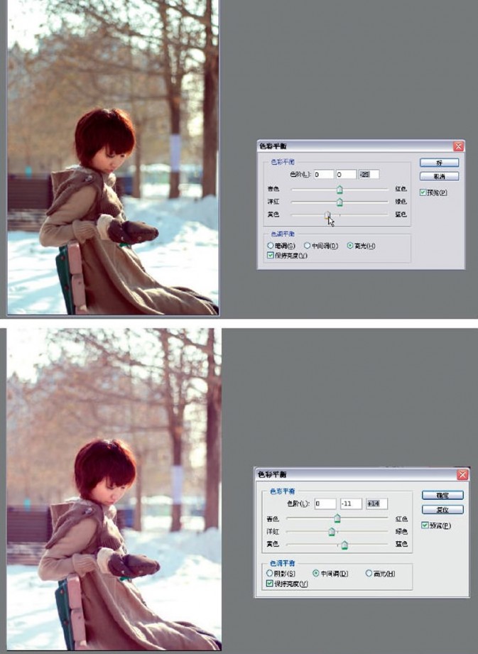 完成上面操作后再选择“高光”选项,选择“黄色”和“蓝色”的色彩区域进行处理,将光标向黄色部分移动?;蚪撞糠值氖档髡?25。这样操作能使照片中的高光部分增加一些黄色。最后,我们选择中间调的处理,稍稍增加一些作品的“洋红”色和“蓝色”,让作品偏紫一些。