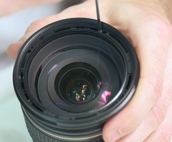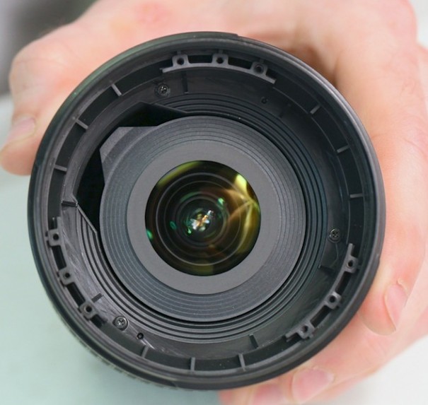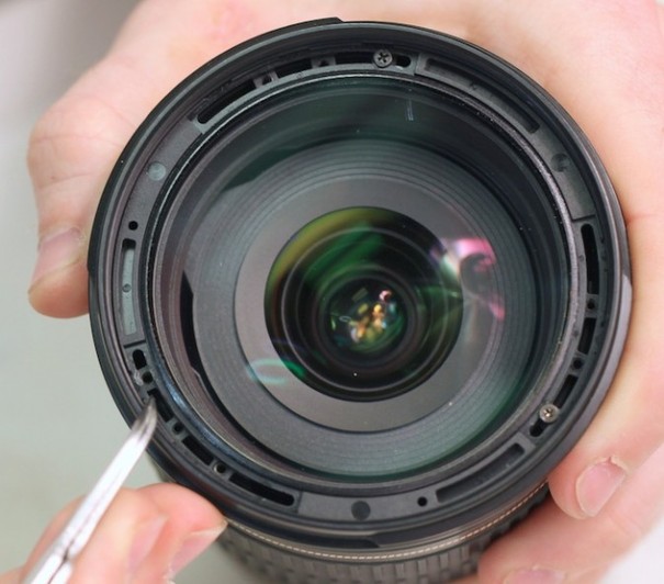 ▲首先,用镊子等工具把镜头前面的装饰环揭开,露出藏在下面的螺丝。