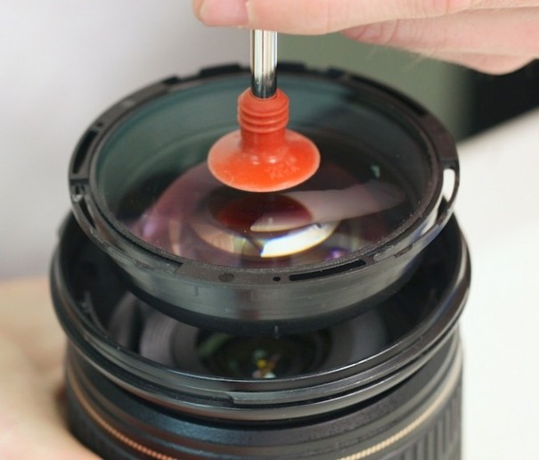 ▲用准备好的真空吸盘吸住镜片中心,将整个前镜组抽起。