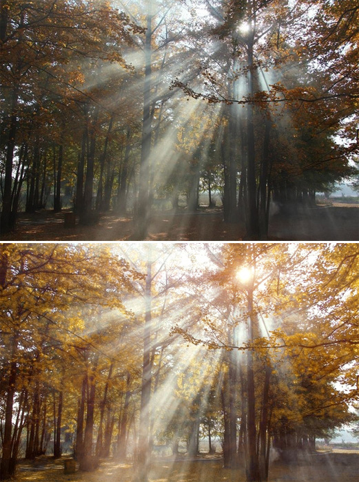 反观这张照片,丁达尔效应,银杏树,这可不是随便都能碰到的场景,后期出来的效果应该不错