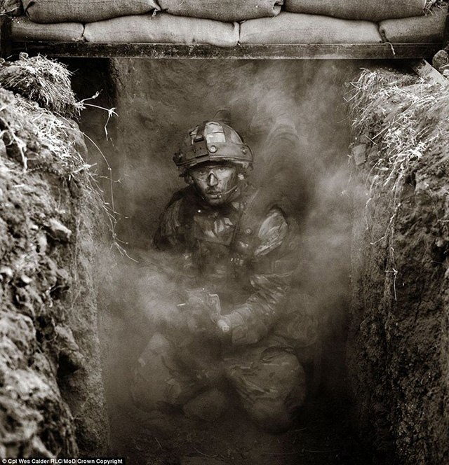 乌烟瘴气的战壕,摄影师:下士Wes Calder RLC,该作品获得了专业肖像组冠军。黎明时分,肯尼亚,在代号为Askari Thunder 6的行动中,威尔士亲王皇家军团一营的士兵Craig Leaman正在战壕中清除障碍。