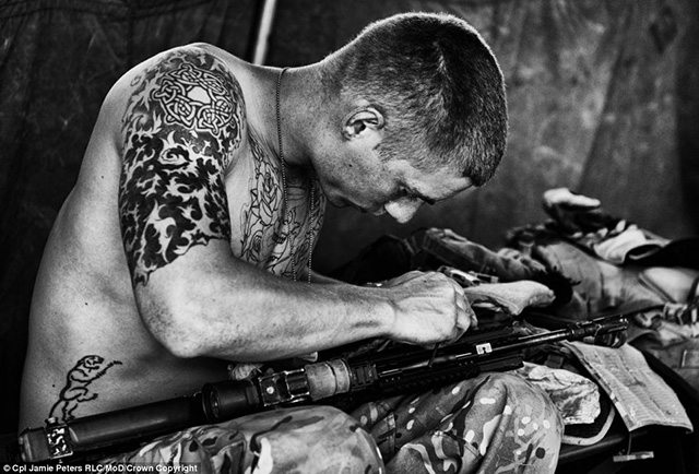 凯尔特战士,摄影师:下士Jamie Peters RLC。巡逻结束后,战士Ross Cunningham正在ANA检查站中擦拭枪支。