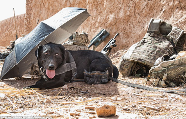 烈日炎炎,摄影师:下士Jamie Peters RLC。阿富汗,赫尔曼德省,一只军犬正躲在伞下避暑。