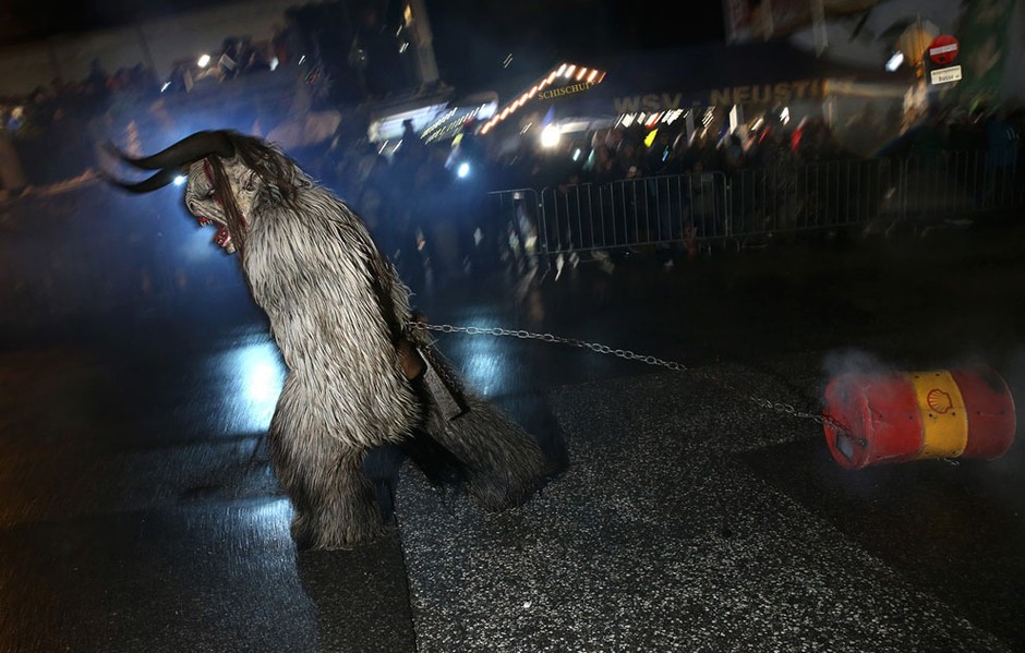 “Krampus”是巴伐利亚地区和阿尔卑斯山其他一些地区的传统活动,每年12月前后举行。Krampus是圣诞老人的原型——圣人尼古拉斯的助手,在当地的传说中,他肩背一个装着礼物的大袋子,手拿一根棍子,好孩子可以收到他的礼物,顽皮的孩子则会被棍子敲打?!癒rampus”的造型有些让人吐槽,看起来如同“恶魔”一样凶残,其实面冷心热??纯此氖芑队潭?,你就知道他的人气有多旺。