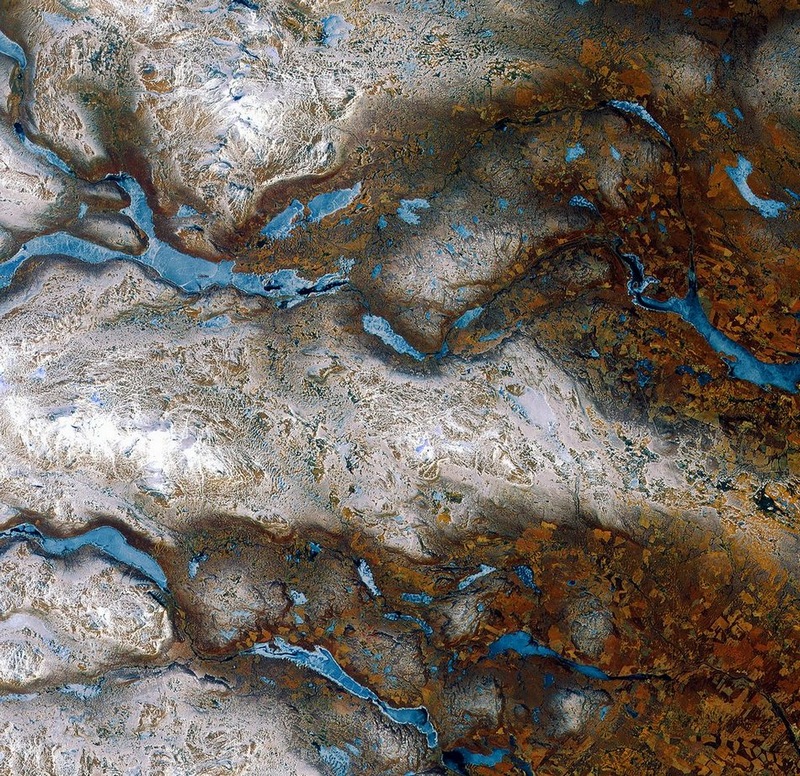 俄罗斯“大图网”发布了一组由欧洲航天局拍摄的地球照片,照片中的山河图景甚至像是玻璃上的蜡染图和霜冻景象,其上的特殊色调不禁让人再次感叹大自然惊人的美丽。