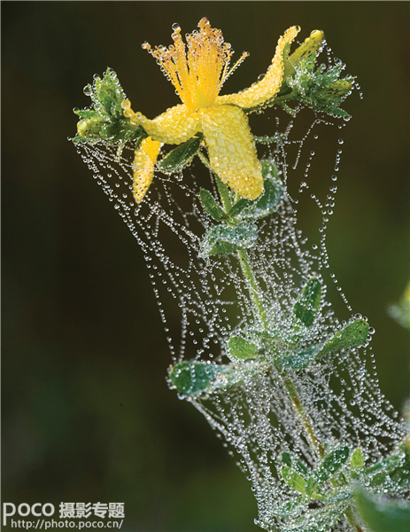 晨露的草地,一定承载着许多可爱的东西,比如这个常见 的圣约翰草上就缠绕着挂满露珠的娇嫩蜘蛛网。