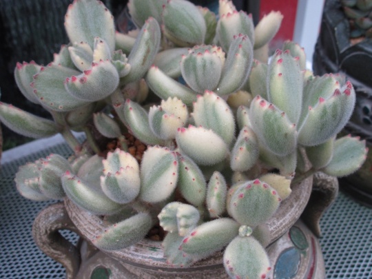 这个长满爪爪的肉植叫做熊童子,不仅长相酷似熊掌,而且爪爪上还有很多绒毛毛。第一次和她邂逅时我不禁诧异,怎么会有植物好像小熊的爪爪,真心萌爆了啊。
