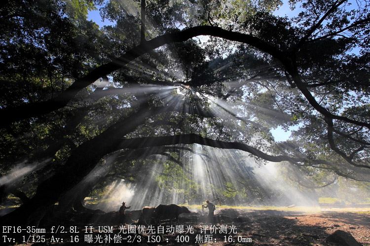 拍摄方法:  收小光圈16,使太阳出现星芒,适当减二档曝光,让对比更明显。因为手持拍摄,所以提高了ISO。之所以用广角端拍摄,是因为我想把人物作为风景的一个点缀,而不是主角,还是尽可能的把大榕树的树形拍下来。这张片子基本上是原片直出,后期不要加对比度,因为一加对比度,雾气肯定要过曝。