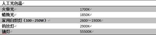 人工光是指各类由人工制造的照明灯具发射的光。按性能可分聚光灯、散光灯,按色温可分成高色温和低色温,按用途可分成日常照明和影视照明专用等等。由于用途、功能的不同,各类人工光的色温也千变万化。常见人工光色温见下表: