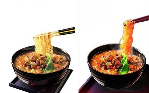 人工光源的色温控制是用人工照明灯具,这种光源的色温经过严格检验都是标准的。对它的色温调控,是根据创作内容的需要而进行的调整。如上图,左边用正常的色温拍摄,画面色彩虽然准确,但是缺少诱人的食品色彩。为了表现出食物的美味,将相机色温值适当调高,或将照明灯色温值调低,使画面呈现暖色,面条的视觉效果就更加诱人了。