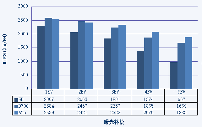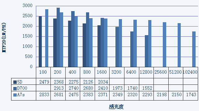 ▲3台机身不同感光度下MTF20分辨率对比