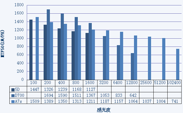▲3台机身不同感光度下MTF50分辨率对比
