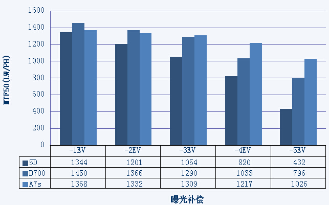 动态范围这个指标不知道什么时候已经成了大家最为关注的传感器性能参数之一。大概是因为高动态范围的传感器所提供的良好环境和光线适应能力吧。从0EV到-5EV的MTF50分辨率衰减佳能5D、尼康D700、索尼A7s分别为60.9%、42.7%和33.5%,在这方面新品的优势比较明显。