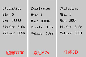 上图中很明显的看出尼康D700和索尼A7s使用的是14bit RAW,而佳能5D使用的是12bit。众所周知,更高位数的RAW文件会更有助于发挥传感器在动态范围方面的性能,所以尼康D700和索尼A7s在动态范围方面大幅度领先佳能5D也是在情理之中。