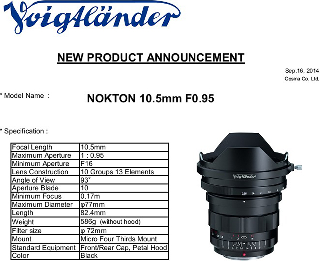 福伦达正式推出第4款f/0.95超大光圈镜头——Nokton 10.5mm f/0.95,适用M4/3系统,等效焦距21mm。该镜头也成为在超广角镜头上应用f/0.95光圈的先例。