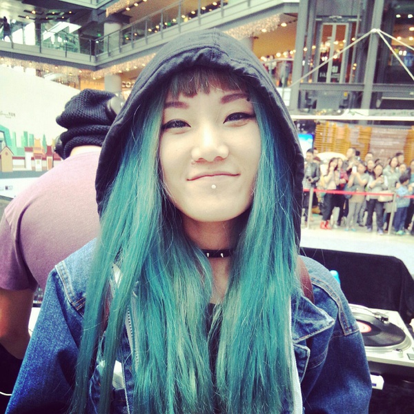 复古骑行活动的上的凉度。她把头发染成了比较少见的蓝色;在脸上穿刺;脖子上戴着铆钉配饰。这样的装扮会让人联想到是性格非常张扬和自我的朋克青年,容易让人产生距离感。但她自然、自信、毫不做作、且亲和,所以非常美。