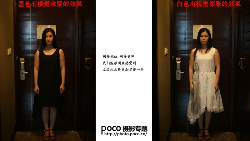 一、服装造型 如果有四套裙子,颜色分别为黑色、白色、灰色、碎花。作为摄影师,你会建议一个没那么瘦的妹纸穿哪一身呢?别犹豫,选黑色!除非其他颜色的服装能100%衬托出妹纸超群的气质或者让妹纸看起来只有80斤,不然就别考虑了。因为黑色有视觉收紧的效果,能让妹纸看起来更瘦,所以黑色绝对是首选哦!