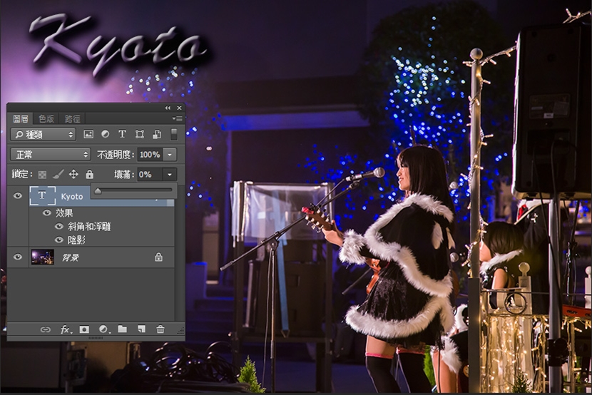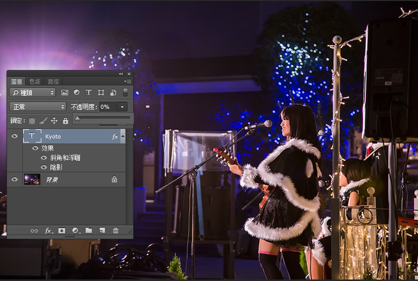 (一) 不透明度 (Opacity) vs 填充 (Fill) 两者最重要的分别,在于不透明度会改变整个图层的透明度,而填充则会保留图层样式(layer style)。下图的底图和文字是分别的两个图层,如果如下图一样,把文字的不透明度降至0,则整个文字消失了。