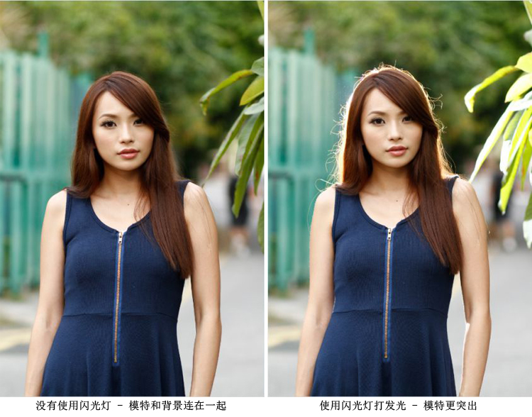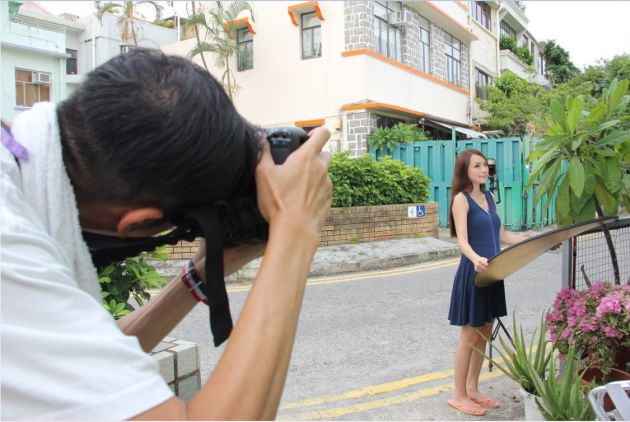 很多时,若模特穿着深色的衣服拍摄,很容易与同样深色的背景分不开,最好当然是换个地方拍摄或者指示模特换成较浅色的衣装,摄影人亦可以在模特的正背后,以闪光灯面向镜头直打,摄影人大可以手动调校闪光灯输出,打出发光的效果,让模特与背景分离,突出模特。另外,更可以利用反光板为模特近距离的补光,减低阴影之馀,形成漂亮的眼神光,看起来更有精神。
