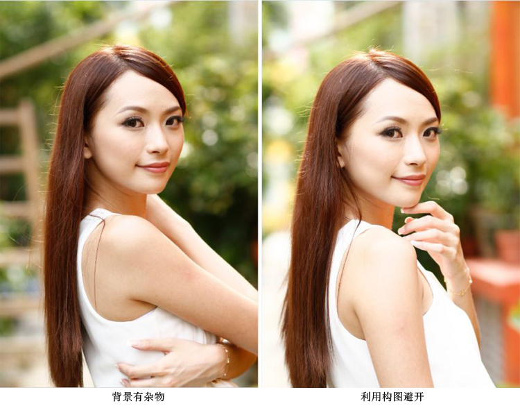 外景拍摄除了天气光线较难控制外,另外一个同样很难控制的地方就是背景!始终拍摄地点多是公众地方,当然会有途人和不同杂物,例如城市景中最常见的广告牌、围栏等,而在郊外地方亦都可能会有垃圾等。很多时,摄影人太过于专注拍摄模特儿的表情动作,就会容易忽略这些杂物闲人,虽然可以在后期制作的时候P掉,但是费神又费时,所以最好就是在拍摄的当初就利用构图的方法,避开杂物闲人,突出模特之余,不会破坏相片所要呈现的气氛。