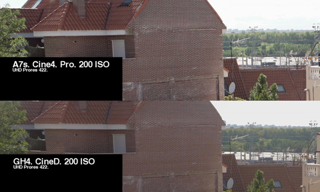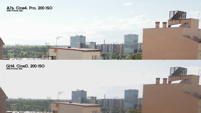 上图显示出两款机器4K视频的动态范围差异,A7s画面天空部分的细节更丰富。其中A7s和GH4分别在Cine4和Cine D模式下拍摄,感光度ISO 200,外接硬盘记录器,ISO 200。