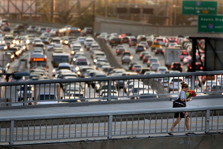 洛杉矶。一名女子拿着花束行走在维尔雪大道的天桥上,此时上百辆汽车正在天桥底下排着队缓慢通过。