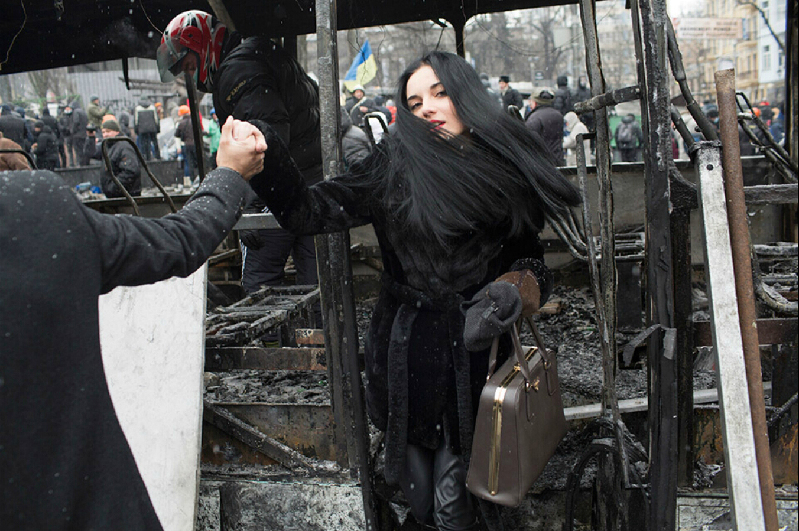 2014年,1月21日,一位年轻的女性从烧毁的汽车中走了下来,这辆烧毁的汽车横置在基辅市中心的胡舍夫斯基大街,充当路障