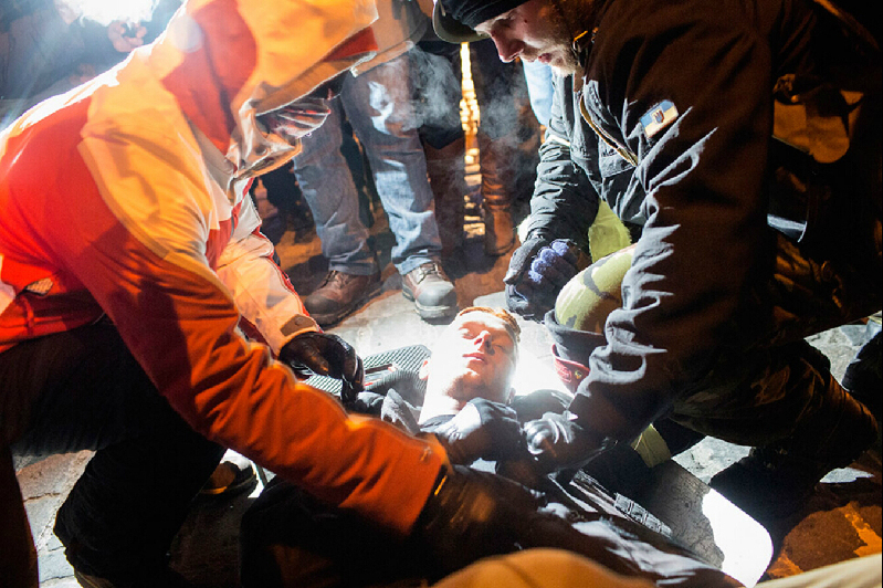 2014年,1月19日,一名受伤的示威游行者正在接受急救,他在与警察的暴力冲突中遭受攻击。暴力冲突的起因是游行示威者想要经过独立广场行进至议会大厦,遭遇到警察的强力阻挡,引发暴力事件。几天之中,至少有3名示威者死亡,上百人受伤