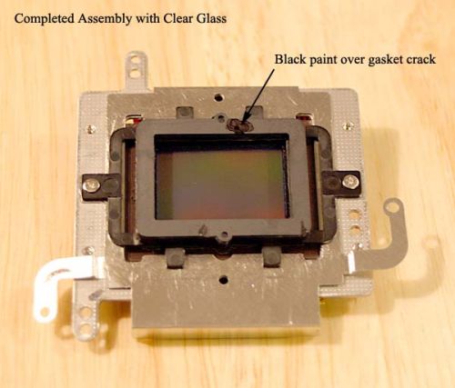 2.30从此进入组装阶段。首先,应该把双面胶粘回滤镜架上。不过首先要确保CMOS感应器绝对无尘??梢允褂闷だ匣⒅啻等MOS上的尘土。CMOS芯片由金属?;た呛吐司导苊芊?,使用两个螺丝相连。这一步如果使用胶水,千万不要将胶水滴到玻璃上。