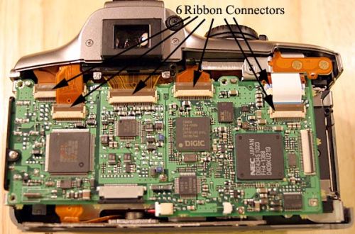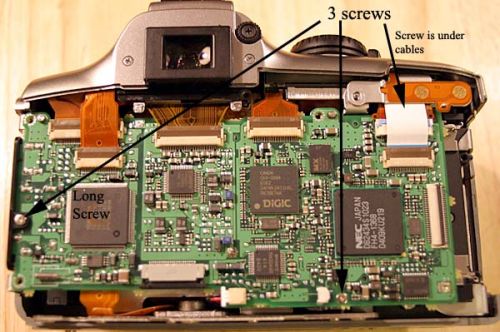 2.34安装箭头所指的三个螺丝。一个是右上角白色排线之下的。左侧的螺丝最长,用来固定黑色塑料的相机端口。然后,连接其余五个排线接口。