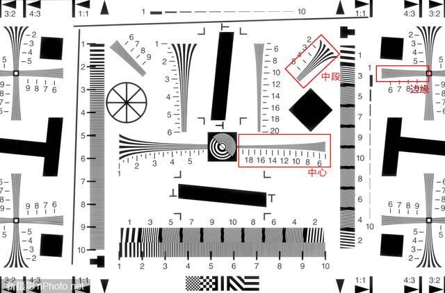 佳能口两支镜头采用EOS-NEX自动对焦转接环进行转接,在机身上进行光圈设置。而尼康卡口镜头只能使用手动转接环,光圈值通过快门速度来进行反推。测试中使用三脚架、快门线,标板截取区域如下: