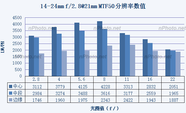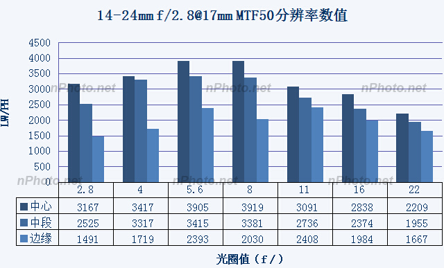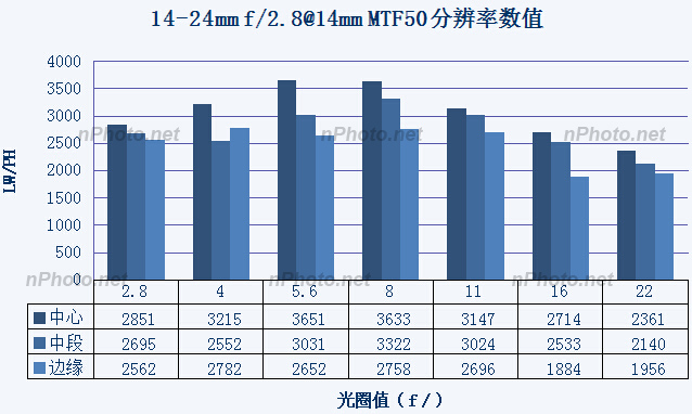 f/8最佳光圈下尼康14-24mm f/2.8G ED的表现相当抢眼。14mm端无竞争对手不好比较,但17mm端中心画质可挑落佳能17移轴,中端部分不相上下,边缘有所不如。而21mm端最佳光圈画质全面胜过蔡司21mm f/2.8,况且14-24mm f/2.8G ED还只是一支变焦镜头——这已然是一个十分可怕的存在。毕竟超广角定焦不像24-70和50/1.4这种镜头的比较,这个焦段哪怕是定焦也很少用大光圈(拍摄星野等除外),14-24mm f/2.8G ED在光圈上打平定焦,小光圈素质上完全不输甚至小有胜出,还坐拥变焦之利,着实可怕。
