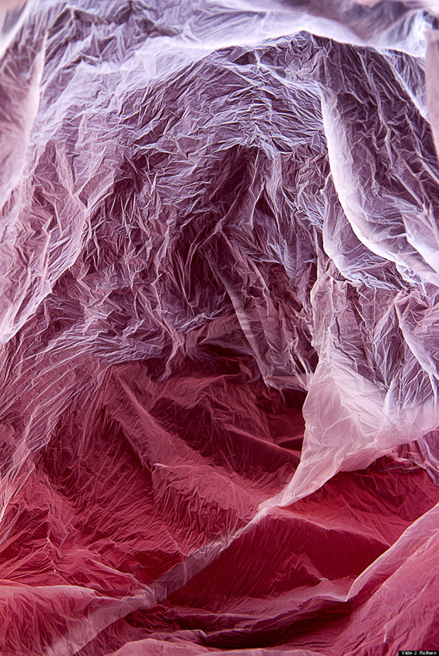 塑料袋,这种我们司空见惯的生活用品对摄影来说有什么用呢?挪威艺术家Vilde Rolfsen就想到用它当拍摄道具,塑料袋表面的褶皱起伏恰似万年冰川和冰雪覆盖的山脉,再配合简单的背景光源,营造出充满中土氛围的风光作品。
